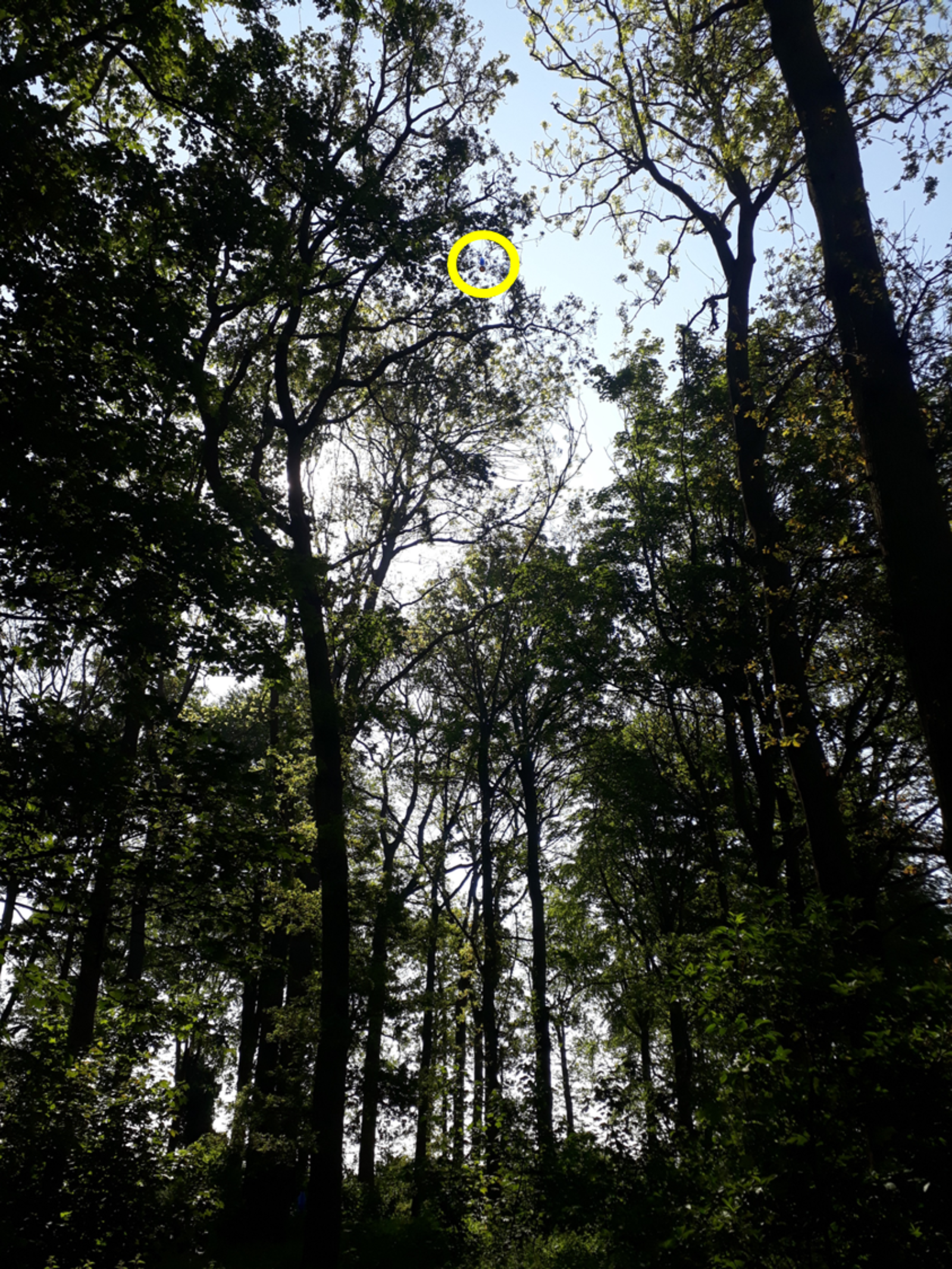 The woodland canopy at one of the sampling sites. The blue vein trap is circled